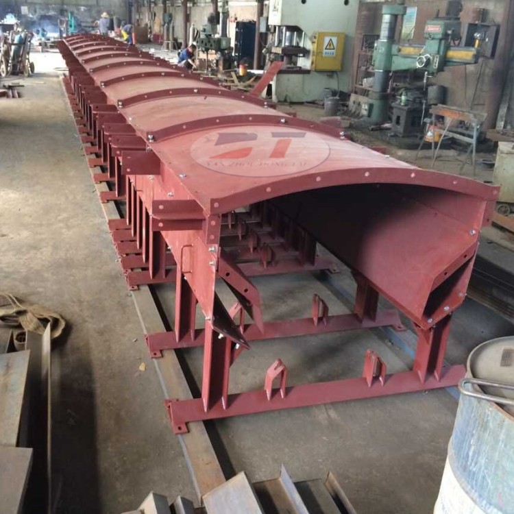 帶式輸送機(jī)導(dǎo)料槽作用:輸送物料特別是輸送粉狀顆粒物時(shí),防物料粉塵飛濺,起到密封滅塵效果。使物料保持在輸送帶上,并使其保持在輸送帶的中央,以防物料的堆積偏心引起輸送帶的跑偏及物料從導(dǎo)料槽的邊緣灑出。在應(yīng)用廣泛的中距離帶式輸送機(jī)中,導(dǎo)料槽的結(jié)構(gòu)對(duì)輸送帶的使用期限有很大的影響。