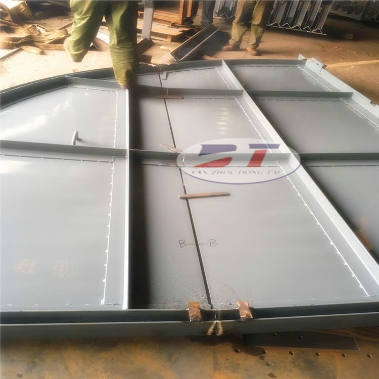 斜風(fēng)井防爆門是安裝在裝有主要通風(fēng)機(jī)的排風(fēng)井口上的特殊密封井蓋。在正常通風(fēng)時(shí),它被用來隔離井下氣流與地面大氣,防止風(fēng)流短路,保證通風(fēng)系統(tǒng)正常。當(dāng)井下一旦發(fā)生瓦斯或煤塵爆炸事故時(shí),防爆門被爆炸的氣流沖擊打開,從而爆炸氣流直接排放到地面大氣,起到卸壓作用,防止主要通風(fēng)機(jī)因爆炸氣流沖擊而造成損壞;當(dāng)主要通風(fēng)機(jī)停止運(yùn)行時(shí),可以打開防爆門,以利用自然風(fēng)壓通風(fēng)。