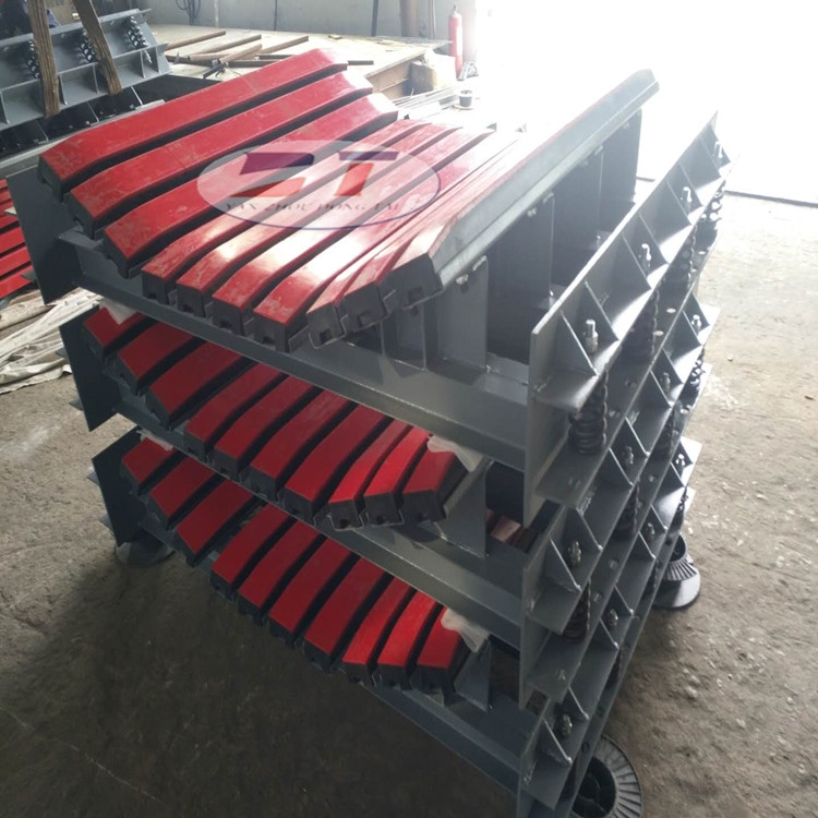 緩沖床主要用于替代緩沖托輥,緩沖床由緩沖條組成,而緩沖條主要應用優(yōu)良的高彈性特種橡膠層充分有效吸收了物料下落時的沖擊力,大大降低了物料下落時對輸送帶的沖擊,真正的改善了落料點的受力狀況。并采用特殊的UHMW高分子聚乙烯表面,使輸送帶與緩沖條之間的摩擦系數(shù)降到低,且耐磨性好。緩沖床的使用保證了輸送帶的面與面的接觸,受力均勻,有效防止了由于托輥斷裂、脫落造成的皮帶縱向撕裂,同時大大降低了皮帶被銳器或尖銳物料穿透后縱向撕裂的概率。