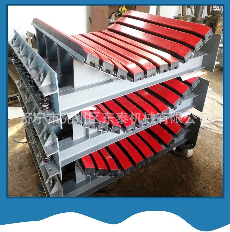 3、緩沖床兩側(cè)的角度采用無級(jí)調(diào)節(jié)設(shè)計(jì),適合不同的輸送帶的運(yùn)量、帶寬及槽角等要求。