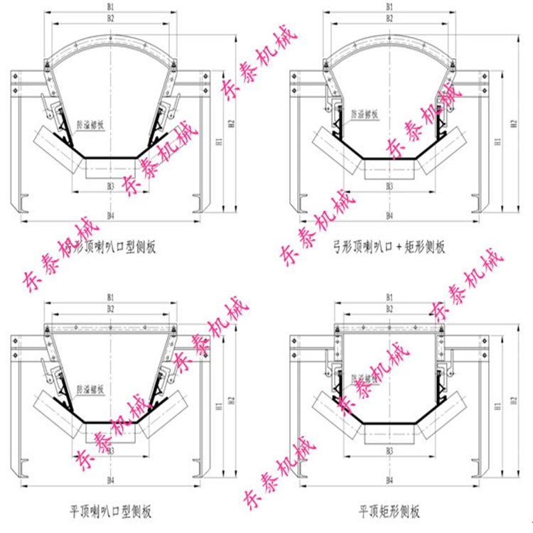 在輸送帶的下面,將原槽型托輥組更換為短槽型托輥組,用來支撐輸送帶的物料重力部位。輸送帶的兩邊非重力部位,用帶有減摩耐磨材料的底板來支撐,即支撐輸送膠帶,又可起密封作用,此支撐底板同側(cè)板連接在一起,側(cè)板同頂板連接在一起,共同組成殼式密封結(jié)構(gòu)。導(dǎo)料槽的底邊寬度為2/3-1/2帶寬導(dǎo)料槽的截面形狀分為:矩形和弧形兩種。導(dǎo)料槽設(shè)計(jì)分為后擋板、槽體、前簾三個(gè)部分設(shè)計(jì)。裝于帶式輸送機(jī)的受料處約束物料不往外撒落導(dǎo)料槽:可使從漏斗落下的物料在達(dá)到帶速之前集中到輸送帶的中部。導(dǎo)料槽的底邊寬度為2/3-1/2帶寬導(dǎo)料槽的截面形狀分為:矩形和喇叭形兩種。導(dǎo)料槽設(shè)計(jì)分為后擋板、槽體、前簾三個(gè)部分設(shè)計(jì)。